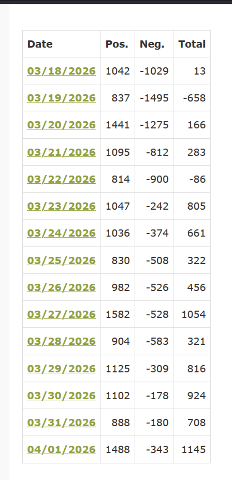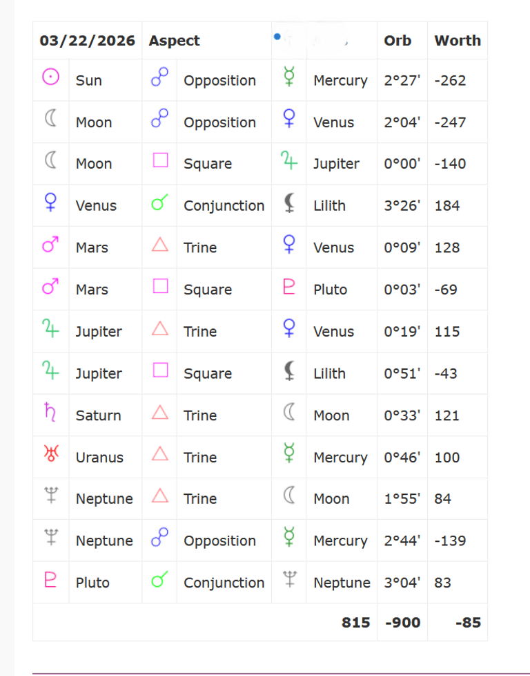 This next table shows the breakdown of one of the days in the above 14 day period with the individual planetary influences and their respective positive or negative influences.